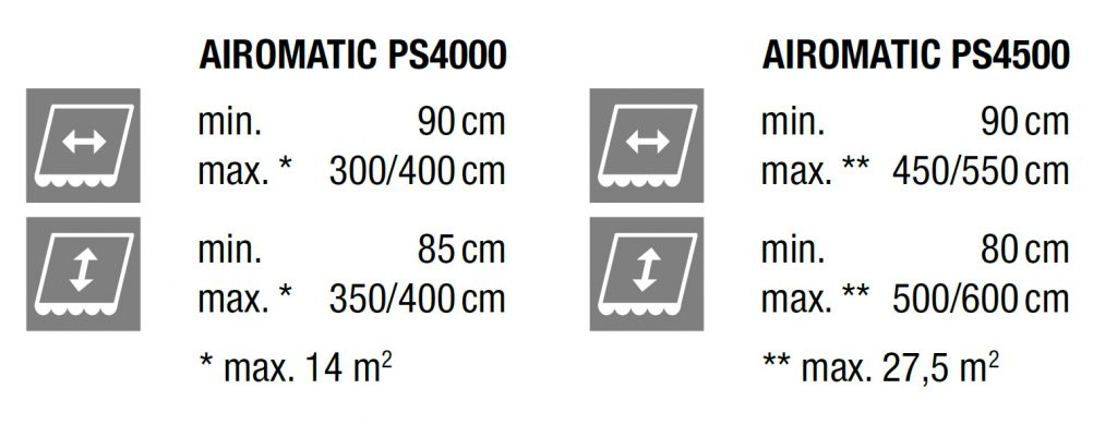 Les deux systèmes AIROMATIC (PS 4000 et PS 4500) sont parfaitement adaptés pour assurer la protection solaire extérieure des jardins d’hiver, verrières ou fenêtres de toitures. Grâce à sa conception compacte, ce système d’ombrage convient parfaitement aux petites et moyennes surfaces. L’élégant caisson autoporteur est en aluminium de haute qualité, comme l’ensemble des profilés et autres pièces de fonderie. En position rentrée, la lame finale ferme le caisson et protège ainsi la toile des salissures et intempéries. Un système breveté de pistons à gaz intégrés dans les coulisses assure une tension constante de la toile. Divers supports de fixation permettent un montage souple et aisé – même sur des cadres porteurs de conception complexe. Moteur électrique Somfy standard.